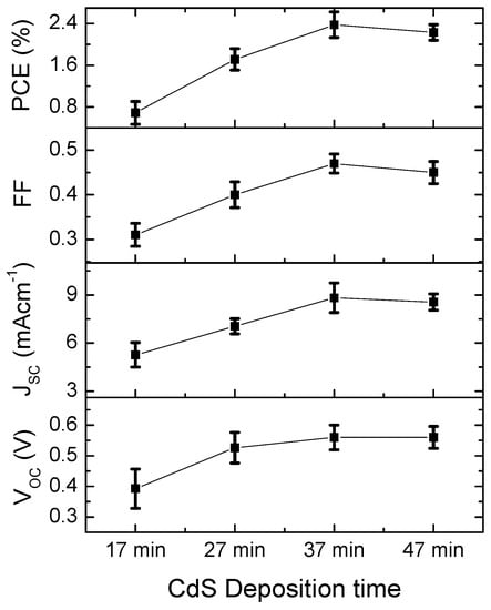 - Esmaeili-Zare, M.; Behpour, M. Fabrication and study of optical properties on CdS semiconductor as buffer layer for Cu(In,Ga)Se2 thin film solar cells. J. Mater. Sci. Mater. Electron. 2017, 28, 10173–10183. [Google Scholar] [CrossRef]