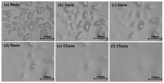 The dissolution process of polysulfone (PSF) powder in epoxy resin at 120 °C, followed by optical microscopy (a) 0 min, (b) 3 min, (c) 6 min, (d) 9 min, (e) 12 min, (f) 15 min.