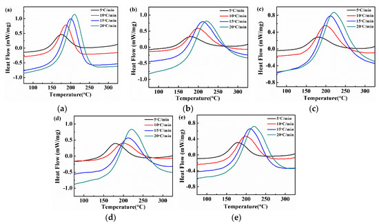 Differential scanning calorimetry (DSC) curves of PSF/epoxy systems at different heating rates of the sample (a) 0 phr, (b) 5 phr, (c) 10 phr, (d) 15 phr and (e) 20 phr.