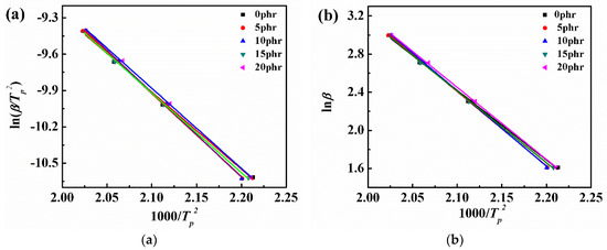 According to the Kissinger and the Crane equations, the peak temperature (Tp) of the PSF/epoxy system with different PSF content at different heating rates β was substituted into the Equations (2) and (3). After that, the ln(β/Tp2) and lnβ were plotted as a function of 1000/Tp, shown in Figure 3a,b, respectively. The slope of each fitted line was obtained by linear regression method. The complex correlation coefficients R2 of the two linear fittings all reached 0.99 or higher, indicating an excellent fitting.