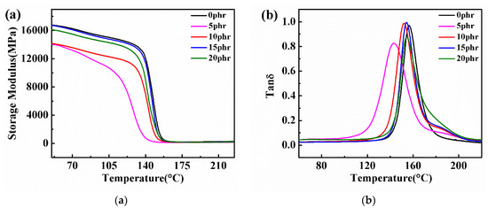 Compared to other methods, involving thermoplastic resins would improve the toughness of the EP without reducing its modulus and heat resistance [12]. Meanwhile, this can also give the epoxy some new properties such as low water absorption and high thermomechanical performances [13], an area that has become a research hotspot in recent years. Rectangular specimens of 36 mm × 13 mm × 3 mm were prepared for DMA analysis, on a single cantilever mode at a frequency of 1 Hz heating from 40 to 250 °C.