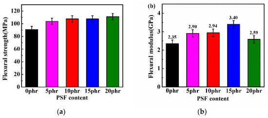 In contrast, the uniformly dispersed PSF particles in the epoxy resin matrix as shown in Figure 10b,c exerted a corresponding improvement in the flexural strength and modulus, fracture toughness and the impact strength as depicted in Figure 7, Figure 8 and Figure 9. The flexural property is critically associated with the intensive rigidity of network chains of the resins. With the increase of the PSF content, this intensive rigidity and internal friction of the networks increase, primarily contributed by PSF identical particles [36]. Herein, the flexural strength and modulus of the samples was also elevated. The enhancement of the impact strength and fracture toughness can be attributed to the fact that PSF particles effectively inhibit the crack propagation in the epoxy resin. Types of toughening mechanisms like crack path deflection or plastic deformation of the resin matrix can also be adopted to account for the increase of the toughness of the PSF/epoxy blends [19,37].