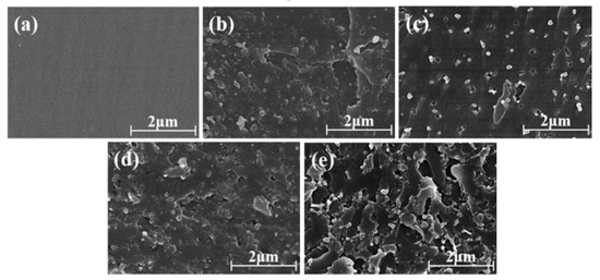 PSF can be well dissolved in Tetrahydrofuran (THF). Thus, the PSF/epoxy blends were etched with THF to remove the PSF phase giving more insights into the phase structures of the two components. The resulting morphologies were observed by SEM and displayed in Figure 11. Only a smooth surface appeared in the sample of pure epoxy (0 phr) demonstrating only one epoxy resin phase as indicated by Figure 11a. However, numerous cavities can be distinctly observed in the micrographs of Figure 11b–d which are the spaces occupied by PSF domains before etching. Furthermore, the numbers and sizes of the cavities also grew with the increase in the PSF content. Therefore, the cured PSF/epoxy blends manifested a two-phased morphology in which the PSF domains were uniformly distributed in a continuous epoxy resin matrix. However, when the PSF content was elevated to 20 phr, the cavities were bonded to each other revealing a continuous phase of PSF. Nonetheless, both the continuous and disconnected epoxy particles were surrounded by a continuous phase of PSF, representing a combination of the bicontinuous phase and the phase inversion morphology as depicted by Figure 11e.