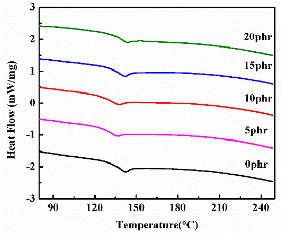 In order to study the impact of the PSF on the thermal properties of the epoxy resin, DSC was used to analyze the glass transition temperature (Tg) of the PSF/epoxy cured products with different PSF contents. As shown in Figure 12, the addition of PSF did not increase but decreased the Tg of the epoxy resin. This might be due to the macromolecular chain of PSF hindering the contact between the epoxy resin and the curing agent, thus lowering the curing degree of the epoxy resin. Meanwhile, the addition of PSF raises the viscosity of the system, which results in an incomplete curing reaction [31,40]. Therefore, the Tg of the PSF/epoxy composites was lower than that of the pure epoxy resin. However, when the PSF content increased, the Tg of the PSF/epoxy composites increased as a whole. We attribute this to the fact that polysulfone inherently possesses a higher Tg, which could have offset its influence on the curing degree of the epoxy resin. The results of the DSC curve are in good agreement with those from the DMA results.