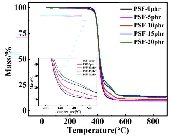 Thermogravimetric curves of PSF/epoxy cured products with different PSF contents.