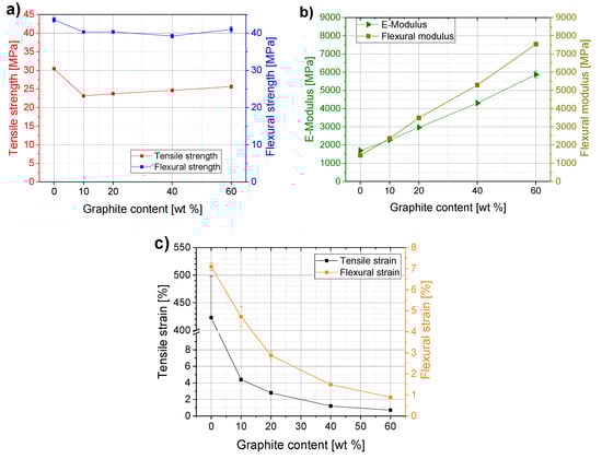 Mechanical properties of PP/graphite composites depending on filler content: (a) tensile and flexural strengths; (b) E-Modulus and flexural modulus; (c) tensile strain at break and flexural strain at maximal stress.