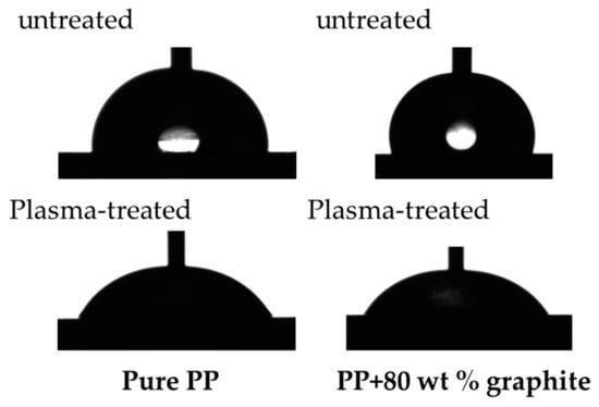 The drop profiles shown in Figure 4 demonstrate that the PP-based materials have a very high water contact angle. While the untreated surfaces of pure PP shows a value of 85.6° ± 5.7°, PP/80 has a slightly higher value of 101.1° ± 3.0°. The high contact angles are caused by different polarities of the water and both substrate surfaces. Water has a high polar part of surface tension (see Table 3) and therefore produces a high contact angle with non-polar surfaces (such as pure PP and PP/80). If the polarities of substrate and liquid are less different between their values, the contact angle is smaller, resulting in better wettability of the surface. Comparably high contact angle values were reported in reference [28], where a 105° contact angle with water was measured on a surface of an epoxy-based composite material containing 80 wt % graphite.