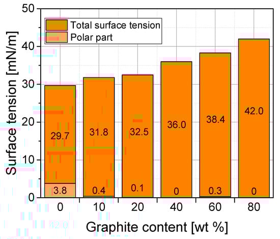 Dynamic contact angle measurements were performed to assess the surface tension and its polar and dispersive parts. The surface tension of materials is generally very important for adhesive joining [27]. Therefore, the surface tension of the graphite composites was calculated to verify the suitability for adhesive joining. A higher surface tension of the substrate has a positive effect on the wettability and adhesion between substrate and adhesive and improves the aging properties of the joint [28]. It is expected that a composite with higher filler content may be more suitable for adhesive bonding than pure PP or a composite with lower filler content. The polarity of the surface has a significant influence on both wettability and adhesion. Polar molecules on the substrate surface can produce stronger chemical bonds with an adhesive, allowing a stronger and more durable bond.