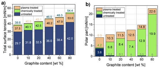 The surface tension of the graphite composites was calculated using the obtained contact angles and Equations (2) and (3). This calculation model makes it possible to determine not only the total surface tension, but also its polar and dispersive parts. Figure 5 shows changes of the surface tension and its polar parts at different filler contents. As explained in reference [27], if polyethylene surfaces are to be bonded, the surface tension of this non-polar material must be increased to at least 48–52 mN/m. Since polyethylene and polypropylene have very similar surface properties, these values can also be regarded as target values for PP. A significant gradual increase in surface tension can be observed as the graphite content increases. The surface tension of pure PP (29.7 mN/m) is increased to 141% after the addition of 80 wt % graphite (42.0 mN/m). Nevertheless, the surfaces of all graphite composites remain non-polar and exhibit very low polar parts of surface tension, which are even lower than the measured polar part of pure PP. Since the polar part does not change with increasing filler content in the composites, the increase in the total surface tension is caused by an increasing dispersive part. In order to increase the surface tension and polarity of the graphite composites, two pre-treatment methods (plasma and chemical) were used, which are well established in polymer surface treatment [24]. The contact angles were measured on the pre-treated surfaces and the surface tensions including their polar parts were calculated (see Figure 5 significant reduction of the contact angle after plasma treatment was observed for pure PP and PP/80 (see Figure 4, bottom line). A distinct increase in the surface tensions of all materials after both, plasma and chemical treatment, was observed (Figure 6a). Based on these results, it is not possible to specify which treatment method is more suitable, as the increase in surface tension for all materials is in the same range (about 10 mN/m) for both methods. Figure 6b shows that surface pre-treatment leads to a significant increase in polarities for all materials. It is interesting to note that a higher graphite content in the composite leads to a higher polarity increase after surface treatment. This becomes particularly clear with the composite material containing 80 wt % graphite, where the polar part of the surface tension increases from 0 mN/m (untreated) to 22.6 mN/m (after plasma treatment). It can also be seen that after plasma treatment, the increase in the polar part of the surface tension is more pronounced for all materials than after chemical treatment.