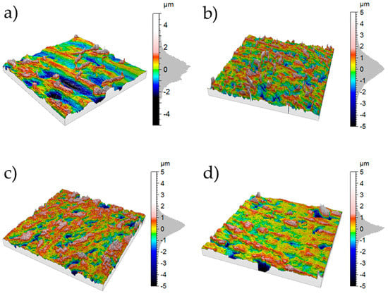 3D surface mapping of (a) pure PP; (b) PP/20; (c) PP/40 and (d) PP/80.