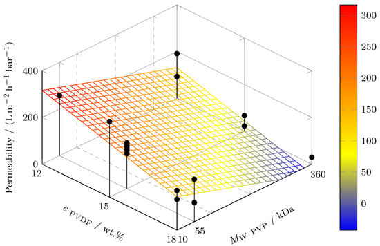 The regression hyperplanes for P and R as functions of cPVDF and PVP are revealed in Figure 1 and Figure 2, respectively. High PVDF concentration and PVP molecular weight lead to low permeability and, vice versa, high macromolecule retention, which is displayed by the model and confirmed by the experiments (black dots). Where less than two dots are shown, the viscosity/solubility was the limiting factor for not carrying out the missing experiments. The regression hyperplanes in Figure 1 and Figure 2 agree with the permeability/retention trade-off. Moreover, it is noted that the chosen screening design is not suitable for parameter optimization. Hence, the presented models may allow to steer the membrane characteristics through variation of the PVDF content and the PVP molecular weight, but no parameter optimum can be derived from the linear regression models.