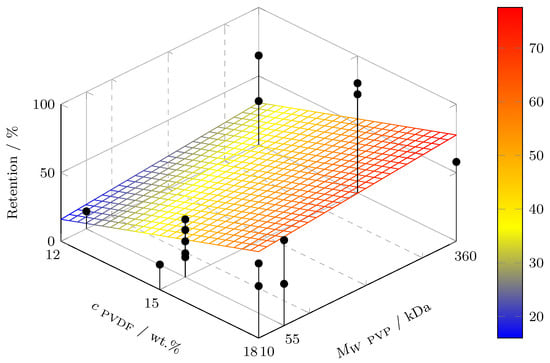 Regression hyperplane showing the linear fit of retention to PVDF concentration and PVP molecular weight at TDope = 35 , TH2O = 35 , cPVP = 5%, PVDF = 585 . Black dots represent experimental values of entire design space (n = 16).