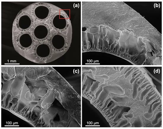 The cross-sectional morphology of PVDF/PVP multi-channel membranes is shown in Figure 3. Firstly, Figure 3a reveals a regular and circular development of the feed channels with the outer and channel diameters in the range of the spinneret outlet dimensions ( / ) and finger-pores at the inner channel surfaces. Wan et al. [46], who studied seven-bore ultrafiltration membranes fabricated from the system PVDF/polyethylene glycol (PEG, = )/N-methyl-2-pyrrolidone (NMP) found lower cut-off values, but—in terms of morphology—a less uniform channel development, which strikes the importance of a customized spinneret design surpressing uncontrollable shear and promoting molecule chain alignment [2,63,67].