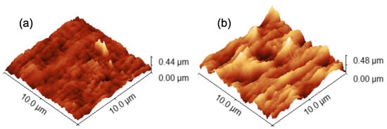 Atomic force microscopy (AFM) images of central channel surface. (a) Root mean square (RMS) roughness = (grain masked for roughness calculation) (ID10); (b) RMS roughness = (ID20). For detailed parameters see Table 1.