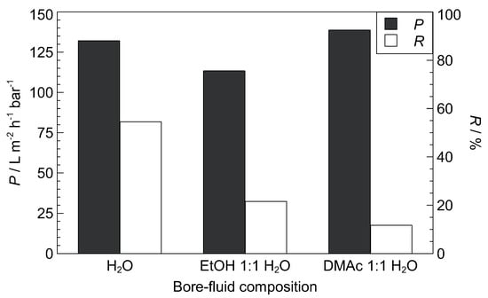 Membrane characteristics are affected by the type and composition of the coagulation medium [5]. The influence of a varied bore-fluid composition, i.e., the inner coagulation medium, on the performance of ID10 (Table 1) is displayed in Figure 5. The retention decreases at organic compound (EtOH or DMAc) addition, whereas the permeability decreases for EtOH addition and increases slightly for DMAc addition. Deshmukh and Li [73] also observed a decrease in permeability with ethanol addition to the bore-fluid for PVDF/PVP gas permeation hollow fiber membranes and explained the observation with a decrease in porosity. They also found an increase in pore size, which may explain the decrease in retention here. In general, a denser skin layer is formed when a strong coagulant such as water is applied, whereas bigger pores, but lower porosity seem to be the result when weaker coagulants, such as ethanol or DMAc are used.