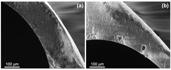 Furthermore, the close-ups in Figure 3b–d show representative examples of membranes with different PVP molecular weight. These images unfold the role of the PVP molecular weight in membrane formation. Whilst the morphology varies only slightly from PVP = 10 to PVP = 55 —solely the deeper void structures enlarge—all membranes fabricated with PVP = 360 exhibit finger-pores on the outer surface as well. As the nascent fibre emerges from the spinneret, phase inversion on the outer surface is induced through the applied steam in the gap between spinneret and coagulation bath [68]. However, if long PVP chains are present in the dope solution, increased shear forces at the spinneret outlet take place and, consequently, an enhanced die-swell effect ocurrs through polymer chain relaxation [69]. This may lead to ruptures in the formed skin layer, which propagate to finger-pores if the PVP molecular weight is too high.