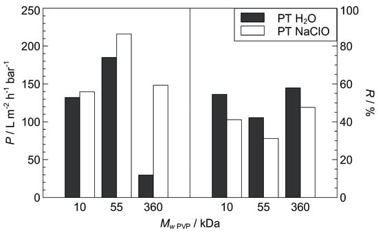 Oxidative degradation and subsequent removal of the co-polymer PVP via sodium hypochlorite post-treatment (PT) is a well-known technique in membrane modification and the PVP degradation mechanism is elucidated in [75,76]. The effect of NaClO PT as a function of different PVP molecular weight has been investigated and is presented in Figure 7. The studied membrane samples were ID10, ID20, and ID6 (Table 1) with a PVP molecular weight of 10 , 55 , and 360 , respectively. The permeability increases through NaClO PT, most notably for higher PVP. An increase in P and a decrease in R was also observed by Pellegrin et al. [77] for NaClO PT of PES hollow fiber membranes with PVP additive. A possible explanation for the PVP-dependence of the post-treatment effect is the amount of PVP that remains in the membrane matrix after phase inversion. Low PVP mostly migrates to the coagulation medium during phase transition due to higher solubility in the non-solvent water, while high PVP has lower non-solvent solubility, may be sterically hindered and remains entrapped in the PVDF network [50], as previously implied in the discussions of the effect of PVP on P, R, and the morphology. Hence, the effect of degenerative PVP removal on the permeability would be much more pronounced for a high PVP, as obstructed pore interconnection paths may be opened, leaving behind a more porous network. Interestingly, the relative decrease in retention through NaClO PT in Figure 7 does not depend on the PVP molecular weight. This implies that the pore size increases through hypochlorite treatment (confirmed by [77]), regardless of the PVP molecular weight. Accordingly, hypochlorite PT leads to an increase in pore size—i.e., retention decreases—and, in the case of a high PVP, clears blocked pore interconnections—i.e., permeability increases.