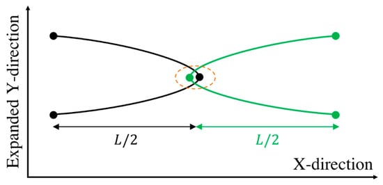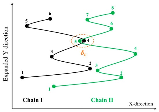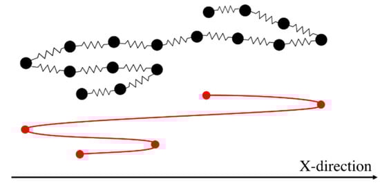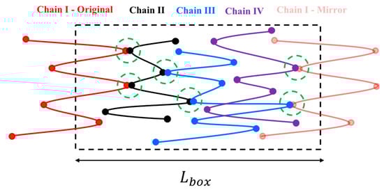 Here, the subscript stands for the kink number and superscript for the chain index. The above four equations are used to solve for the four unknowns, , and . These four equations are coupled to equations for other kinks through the forces and that also appear in Equation (5). To simulate the response of an entangled system from the kinked state to the fully unraveled one, we generate a one-dimensional simulation box with length and randomly distribute in their kinked states within the simulation domain. Two kinks from two chains are considered entangled if (1) they have opposite polarity in the x-direction (the extensional axis) and (2) they are closer than a certain distance . The force equations of the two kinks that are entangled at an entanglement point are coupled as specified by the system of Equation (5). Therefore, we have a system of equations where is the number of entanglement points in the simulation box; each entanglement point is shared between two entangled kinks on different chains coupled at the entanglement point (, being the total number of entangled kinks in the box). The pre-factor of 4 in () comes from the four equations we need to solve for each entanglement point, Equation (5). The initial entanglement fraction is defined as the total number of entangled kinks () divided by the total number of kinks () and can be adjusted by changing and . To obtain a statistically uniform distribution of entanglement points in the system, a periodic boundary condition (PBC) is applied at the simulation box limits, and . Note that without the PBC, all the kinks at the boundaries would be free. If a chain crosses the periodic boundary, its image is created on the other side of the box and the kinks of the image chain will be entangled with other chains, based on the polarity and adjacency criteria explained earlier; see Figure 2.