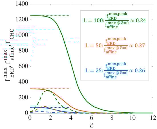 Evolution of the ensemble-averaged maximum kink force () for different chain lengths (blue), (orange), and (green) at asymptotically high strain rates. For each length, the ensemble averaged force is shown for both affine motion of kinks (solid lines) and EKD simulations with (dashed lines). The horizontal dotted lines give the maximum possible force, at an entangled kink for each chain length, obtained from Equation (7) as discussed in the text. The units of the force are set by the parameter values ; i.e., the dimensional force is obtained by multiplying the plotted force by times the square of the unit of length.