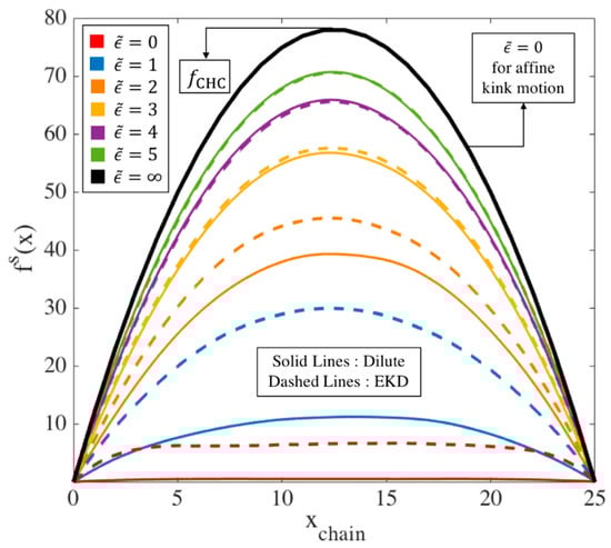 On the other hand, for the same chain length, with 80% initial entangled kinks in an EKD simulation, the evolution of the maximum kink force is drastically different as shown in Figure 3 by the dashed lines. First, the peak occurs at a finite strain ( Hencky strains) rather than instantly after startup of the simulation and also the peak tension is much smaller than for affine motion. In EKD simulations, the tension distribution along the whole chain (not just at the kinks) is initially nearly uniform, except at the chain ends, and then eventually evolves into a quadratic dependence, which takes almost Hencky strain units to occur for the chain length considered. The tension distribution of a dilute chain, also plotted in Figure 5, is initially lower than that of the entangled chain, but merges with it at . This is because no re-entanglement is implemented, so that after annihilation of entangled kinks due to unraveling, the entangled chain becomes dilute and loses all its entanglements by .