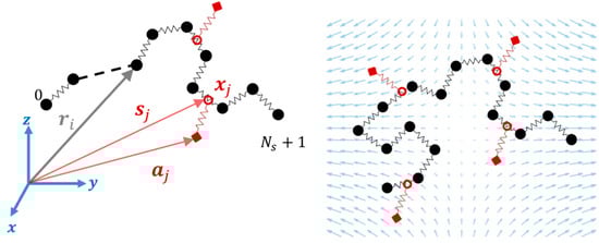 Schematic of slip-spring simulation in an extensional flow. Position vector of a bead (), anchoring point of a slip-spring (), position of a slip-link on the chain (), and a dummy variable () of a slip-spring along a chain are shown on the left. On the right, a uniaxial extensional flow is applied to this single-chain model of an entangled polymer, where each slip-spring anchoring point (red squares) moves affinely with the flow until the force generated in the virtual spring (red) reaches a maximum value.
