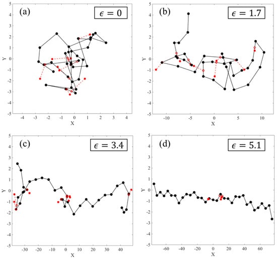 Evolution of a sample chain with () at , at Hencky strains of (a) , (b) , (c) , and (d) . Notice the x scale, but not the y scale, is increased in range at large strains. Main chain beads and springs are shown with black circles and lines, respectively, while slip-springs are shown in red, extending from their anchoring points marked with solid red circles to their positions on the chain, marked with open red circles. A maximum slip-spring force is used, and regeneration of slip-springs is turned off.