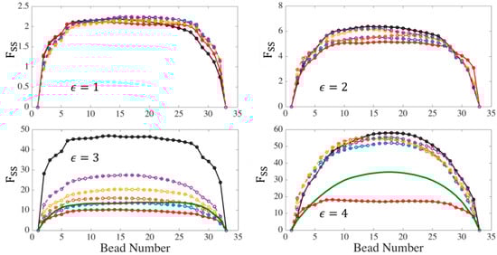 Values of for three chain lengths are plotted as dotted horizontal lines in Figure 3. Figure 3 reveals that for affine deformation, initially takes this highest achievable value, , which is at the center of the chain with force away from the center distributed along the quadratic curve shown by black line in Figure 5. As the chain unravels under affine motion, kinks near the chain center move away from each other and the strand length between them increases. With fewer kinks and fewer forces, the maximum of these is less likely to be near the peak of the black curve and more likely to be off to the side, and lower in value, producing the decrease in maximum force shown by the solid lines in Figure 3.