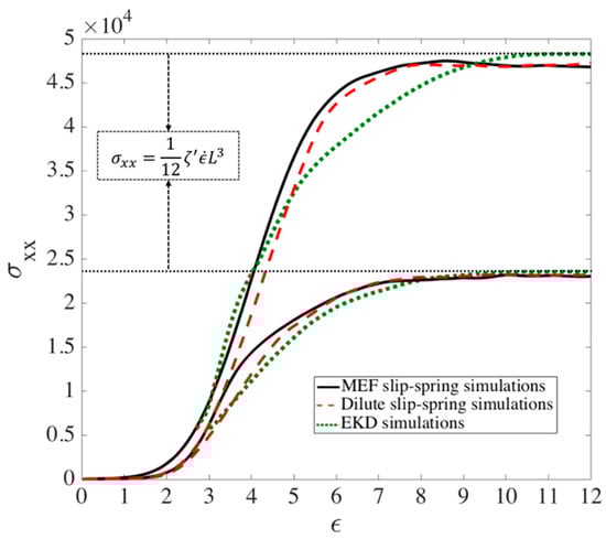 Extensional stress in x-direction () for chains of length (lower set of curves) and at (upper set of curves). Black lines are obtained under the MEF assumption while the dashed red lines are for chains without slip-springs; i.e., dilute chains. EKD results, plotted starting from the transition strain , are shown with green dotted lines. The two horizontal dotted lines show the theoretical final stress value that an entangled or unentangled chain will achieve when fully unraveled. The results for both slip link methods and EKD are averaged over an ensemble of 150 chains.