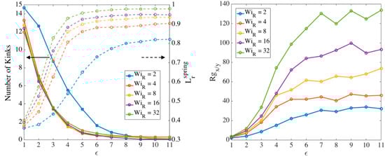 Evolution of (left) number of kinks (left axis) and averaged extension of springs (right axis) and (right) relative radius of gyration () for a chain with at different Weissenberg from slip-spring simulations with maximum entanglement force (MEF) condition. The averaged extension of springs is calculated using Equation (14).