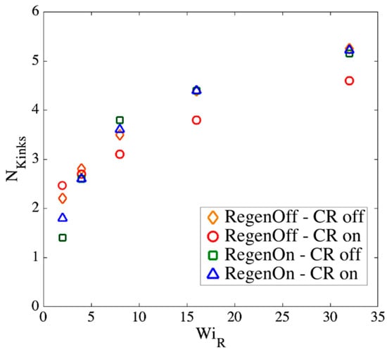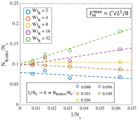 A linear correlation , is observed between the number of kinks and number of springs, with the ratio converging to at high values of . This is close to the value obtained in our previous publication where we counted the number of kinks only at for all cases, while here we count the number of kinks at the strains corresponding to the onset of the kinked state at each Weissenberg number for each chain length. As explained before, and can be related to the molecular weight of a specific polymer based on its characteristic ratio [61].