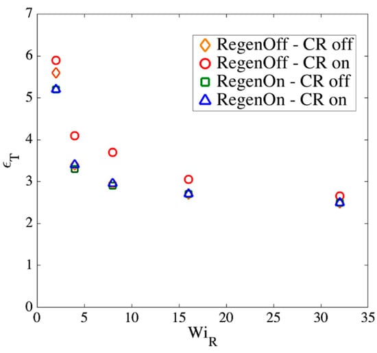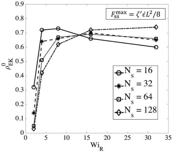 Based on Figure 12, by a Hencky strain of around the chain is almost a one-dimensional object with for high Weissenberg numbers. At around the same strain, the average extension of springs also reaches the criterion chosen earlier. Based on our observation of chain’s conformation evolution—e.g., Figure 12—we find the strain () at which the two criteria (nearly 1D configuration and average spring stretch of 70%) are met and plot the results for different chain lengths in Figure 13.