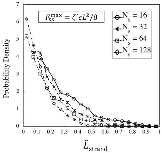 The superscript (0) is used because the entangled kink density is calculated at the transition strain determined from the slip-spring simulations; this value, given by Equation (15), is used as the initial entanglement fraction of kinks in the kink dynamics (EKD) simulations which start at . Figure 15 shows the ratio of the numbers of entangled to total kinks for different chain lengths obtained from slip-spring simulations, with no slip-spring regeneration or constraint release.
