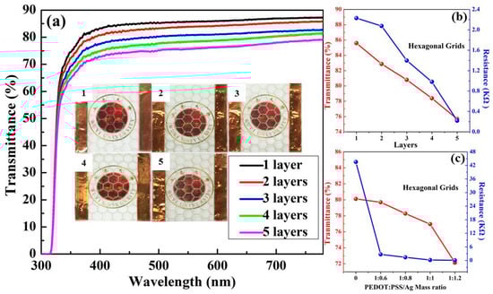 (a) Optical transmittance spectra of the Ag NWs/PEDOT:PSS hexagonal grids printed with 1 to 5 layers; the insets are photographs of corresponding grids. Variation of the transmittance at 550 nm and resistance of hexagonal grids with (b) the printed layer and (c) the mass ratio of PEDOT:PSS to Ag NWs.