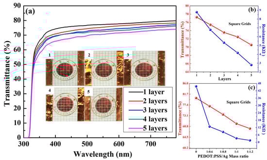 The pattern shape is another factor determining the film performance. Therefore, the hexagon and square grids were printed for comparison. Figure 4a depicts optical transmittance spectra of the Ag NWs/PEDOT:PSS hexagonal grids printed with 1 to 5 layers. The film thickness can reach several micrometers. With the printing layer increased, the pattern of each layer would not be completely overlapped. Thus, the deviation among the printing patterns gradually increased, leading to the decrease of the transparency and conductivity uniformity of the grid. Resultantly, the printing layer of the grids is controlled to be 5 at most. The grid transmittances at 550 nm were 85.6%, 83.9%, 80.8%, 78.4% and 75.7% as the printing layer correspondingly increased from 1 to 5. The insets of Figure 4a are photographs of the grids printed with various layers, suggesting that the grid lines become easier to recognize, and all composite films are able to maintain high transparency. Figure 4b describes the transmittance and resistance of the composite films as a function of the printing layer. The transmittance and resistance both decreased with the increase of printing layer. The resistance of the composite film correspondingly is dropped from 2.23 to 0.22 kΩ, along with the printing layer increasing from 1 to 5. It should be clarified that the film conductivity is evaluated by the resistance between two sides of the film rather than sheet resistance in this work. This is because the line width of the grids using the screen-printing technology is relatively large, and the average conductivities of the grids are better characterized by the resistance than by sheet resistance.