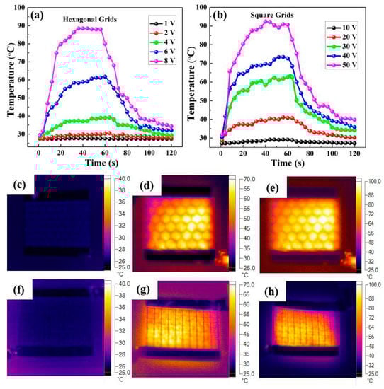 Figure 6a,b depict the temperature profiles of the hexagonal and square grids, which are plotted with respect to various voltages. The generated temperature of the film heater increased as the voltage increased. When the applied potential on the hexagonal grid increased from 1 to 8 V, the film heater rose in temperature from 27.2 to 88.5 °C. However, the square grid needs a higher voltage to heat to a comparable temperature. When the potential was set at 10, 20, 30, 40 and 50 V, the saturated temperature was 29.1, 40.1, 62.3, 73.3 and 92.4 °C, respectively. Figure 6c–e presents the typical infrared thermal images of the hexagonal grid at the voltage of 1, 6 and 8 V, while Figure 6f–h shows the infrared images of the square grid at the driving voltage of 10, 40 and 50 V. The heat distributions of the grids are uniform across the whole substrate, revealing excellent application prospects in large-scale and uniform heating. The hexagonal grid exhibited a lower driving potential than the square grid, which could be ascribed to its better conductivity.