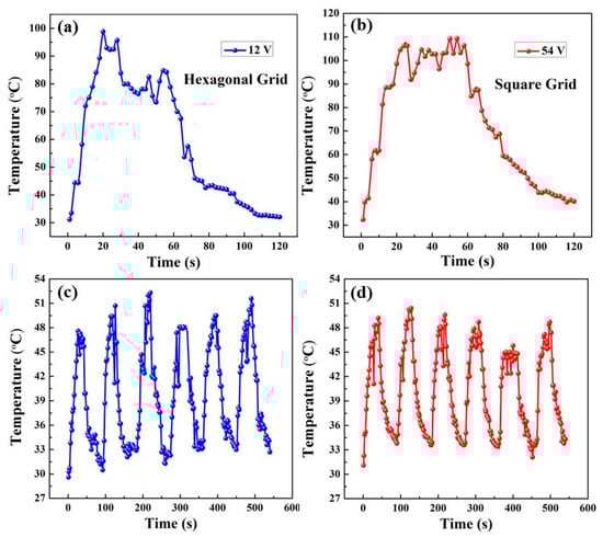 Figure 7c,d presents the on/off response of the film heaters with hexagonal and square grid, which was respectively characterized under driving voltage of 5 and 25 V. The heating and cooling time in each cycle was 40 and 50 s. The cycling curves of two grids indicated relatively stable temperature recoverability and saturation temperature of 50 °C. A long on/off response for the film heaters with hexagonal and square grid for 8 h was also conducted, with the stable recoverability indicating that the flexible heaters based on the Ag NWs/PEDOT:PSS composite grids can constantly rerun at a given potential for a long time.