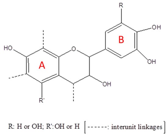 Prolonged exposure to ultraviolet (UV) radiation represents a well-known problem for polymeric materials [,,]. It determines color loss, macroscopic fragmentation, and progressive reduction of molecular weight; hence, bettering understanding of the involved mechanisms and developing new methods to slow down this type of degradation are extremely active fields [,,]. Modern additives for polymers are capable of absorbing the UV radiation or blocking the free radicals and peroxides produced during the degradation process [,]. These substances are generally produced from non-renewable sources, and bio-based materials should not rely on them to improve their performances [,,]. On the contrary, molecules obtained from renewable resources are a desirable alternative []. Tannins, flavonoids, and other macromolecules classified as polyphenols are very interesting candidates from this point of view []. They are present in many types of plants and play a fundamental role in their protection against pests and diseases. In particular, tannins are one of the most abundant groups of compounds of vegetable origin and are readily available throughout the world []. Tannins can be classified as either hydrolyzable or condensed. Hydrolyzable tannins are made of simple phenolic products, being esters of gallic acid and their dimers (digallic acid, ellagic acid), and monosaccharides (especially glucose). They have already been used as partial substitutes for phenol in the manufacture of phenol formaldehyde resins [,]. Condensed tannins consist of flavonoid units with different degrees of polymerization. They have been associated with their precursors: catechins (flavans-3-ols), leucoanthocyanins (flavanes-3,4-diols) [,], and carbohydrates. This class of tannins is produced in the normal metabolism of plants, which explains why they are considered physiological and are widely present in plants across the planet [,,]. Condensed tannins are used in many industrial applications (i.e., as glues for wood products, dyes for leather, etc.) [,,] and constitute more than 90% of the world production of tannins. Due to its chemical structure (Figure 1), which constitutes a high amount of multiple phenolic hydroxyl groups, they could be used as a platform for producing reactive polyhydroxyl chemicals [,] and, hence, for precursors in polymer synthesis.