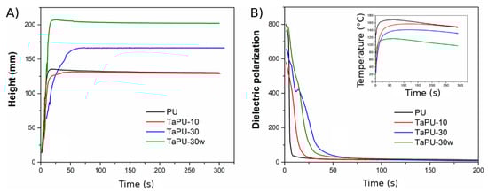 Kinetics curves of PU, TaPU-10, TaPU-30, and TaPU-30w foams: (A) height vs. time, (B) dielectric polarization vs. time (inset: Temperature vs. Time).