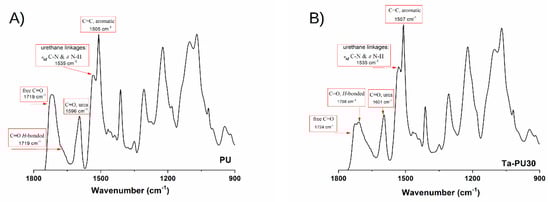 FTIR spectra of (A) pristine PU and (B) TaPU-30.