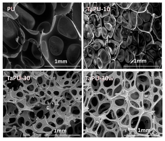 SEM images of PU, TaPU-10, TaPU-30, and TaPU-30w foams.
