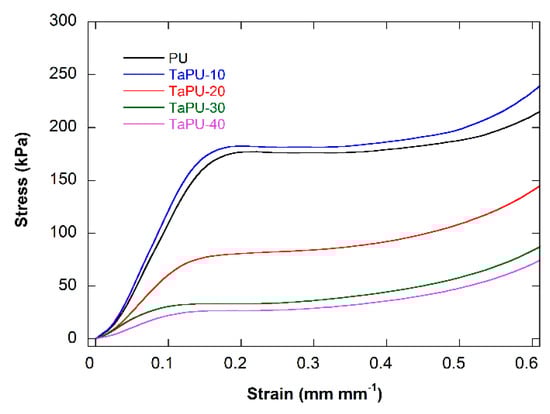 The effects of CT on the compressive stress/strain behavior of PU and TaPU foams are shown in Figure 5. Mean values of the mechanical parameters, in terms of Young’s modulus in compression, stress and strain at yield, and critical strain (defined as the strain at 190 kPa, from DMA tests), are reported in Table 3. Since the foams showed different densities, specific values of the mechanical parameters were calculated by normalizing to the foam density. The addition of CT had a non-linear effect on the mechanical behavior. At 10 wt %, CT improved both the modulus and yield strength, but with an increase in content, the entire curve lowered proportionally.