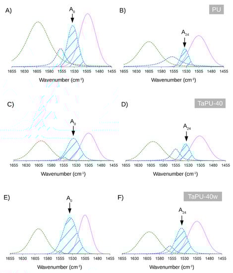 Deconvoluted spectra of PU, TaPU-40, and TaPU-40w before and after UV exposure for 24 h: (A,C,E) before UV treatment; (B,D,F) after UV treatment.
