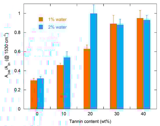 As reported in several papers [,,], chemical structure analysis by FTIR investigation helps to observe changes in the intensity of peaks related to the bonds that interact with the UV radiation. According to Rosu et al. [], the urethane linkage, under the action of UV radiation, could undergo photo-Fries rearrangement (schematized in Figure 7) by inducing a reduction in the νst C–N absorption peak area. The UV degradation effect can be estimated by calculating the area under the peak centered at 1530 cm−1 (related to νst C–N). To quantify the UV degradation effect on PU and TaPU foams, the ratio (A24h/A0) between the area under the νst C–N peak after the 24 h treatment (A24h) and its value before UV exposure (A0) was calculated from deconvoluted FTIR spectra. Selected FTIR spectra are reported in Figure 8 to show how the convolution process allowed us to distinguish the area under the 1530 cm−1 peak. The values of A24h/A0 are reported in Figure 9 for all samples. The pristine PU foam showed a low A24h/A0 ratio (32%) due to the occurrence of the photo-Fries rearrangement of urethane linkages. The presence of CT, on the contrary, reduced the sensitivity to UV degradation in all formulations. In particular, the highest protection of the urethane linkages—hence, the highest values of the A24h/A0 ratio—was obtained at 30 and 40 wt %. Thanks to the aromatic chemical structure, tannin behaves as a sacrificial UV inhibitor by absorbing UV radiation through the π → π* transition in un-saturated bonds. The degradation has an inverse relationship with the tannin content, and it is very low at 30 wt % and 40 wt %. The same behavior was detected in the lower-density foam series produced with added water.