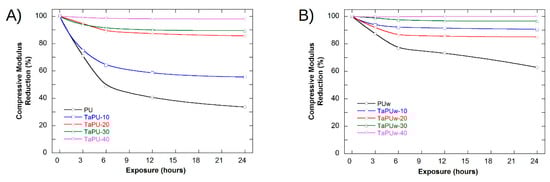 Percentage reduction of the compressive modulus as function of UV exposure time: (A) without added water; (B) with added water. (The solid lines are shown to guide the eyes.)