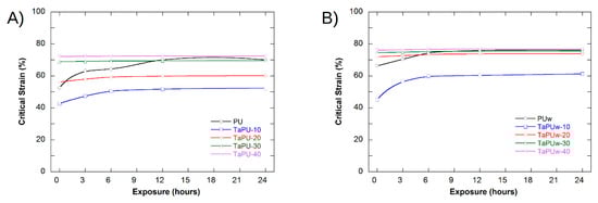 Variation of the critical strain as a function of UV exposure time: (A) without added water; (B) with added water. (The solid lines are shown to guide the eyes.)