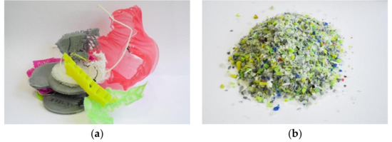 Appearance of polylactide waste: (a) after 3D printing, (b) after grinding.