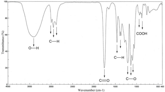 Analysis of PLA-polyol in FTIR spectroscopy (Figure 3) showed that there were characteristic bonds of the structure of lactide esters. The spectrum of this polyol showed high band intensity at 3400 cm−1, which indicated the presence of O–H bonds in the hydroxyl groups. Bands at 2880–3000 cm−1 (stretching) and 1360–1460 cm−1 (deformational) belonged to the C–H bond of the –CH2– and –CH3 group; 1640–1760 cm−1 (stretching) to the C=O bond of the ester group, 1050–1270 cm−1 (stretching) to the C-O bond of the ester group, and 870–930 cm−1 to the free carboxyl group.