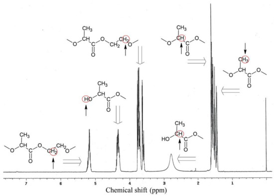 1H NMR spectrum analysis showed characteristic chemical shifts for 1.43–1.44 ppm protons of methyl group from lactic acid monomers, 1.5–1.6 ppm protons of the α-CH2 group to the carbonyl group, 2.6–2.9 ppm protons of tri-substituted carbon in the α-position to the hydroxyl group (ending of polymer chain), 3.7–3.8 ppm protons of α-CH2 groups to the alcoxyl group (from glycol), 4.2–4.3 ppm protons of hydroxyl groups in macromolecules, and 5.17 ppm protons of α-CH2 groups to the ester group.