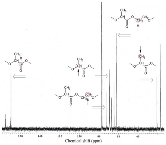 13C NMR spectrum analysis showed characteristic chemical shifts for 16.61–20.32 ppm carbons of methyl groups, 61.61–61.71 ppm carbons of β-CH2 groups to the alcoxyl group, 68.57–69.21 ppm carbons of α-CH2 groups to the ester group, 72.29 ppm carbons of α-CH2 groups to the alcoxyl group, and 169.59 ppm carbons of the carbonyl groups.