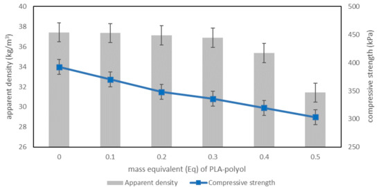 However, the apparent density of RPU/PIR foam is in close relation to its physicomechanical as well as thermal insulation properties [36,37,38]. Increased elasticity of the polymer matrix and decreased density of the obtained RPU/PIR foams significantly affected their compressive strength (Figure 7).